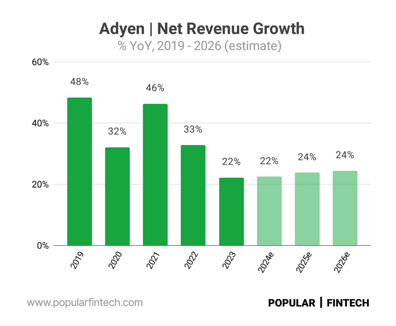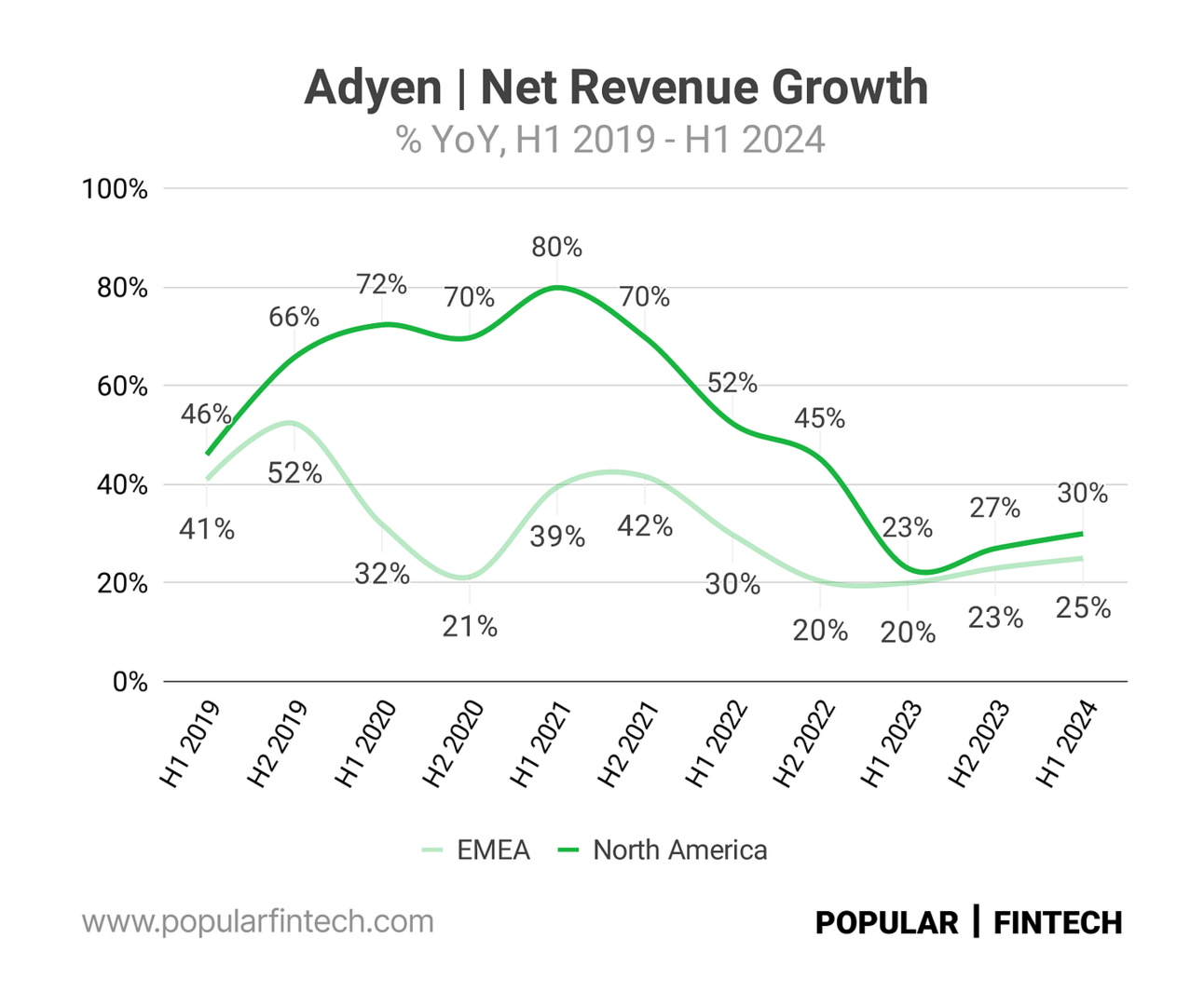 Adyen’s net revenue growth (Adyen does not disclose information about payment volumes by region), both in Europe and in North America, also bottomed in H1 2023 at 20% YoY and 23% YoY respectively, and started accelerating after that.