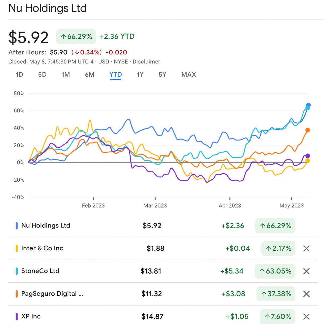 Speaking of Brazilian publicly traded Fintech companies…Inter&Co (NASDAQ: INTR) and XP Inc (NASDAQ: XP) are underperforming NASDAQ, but Nubank (NYSE: NU), Stone (NASDAQ: STNE), and PagSeguro (NYSE: PAGS) are doing really well this year!