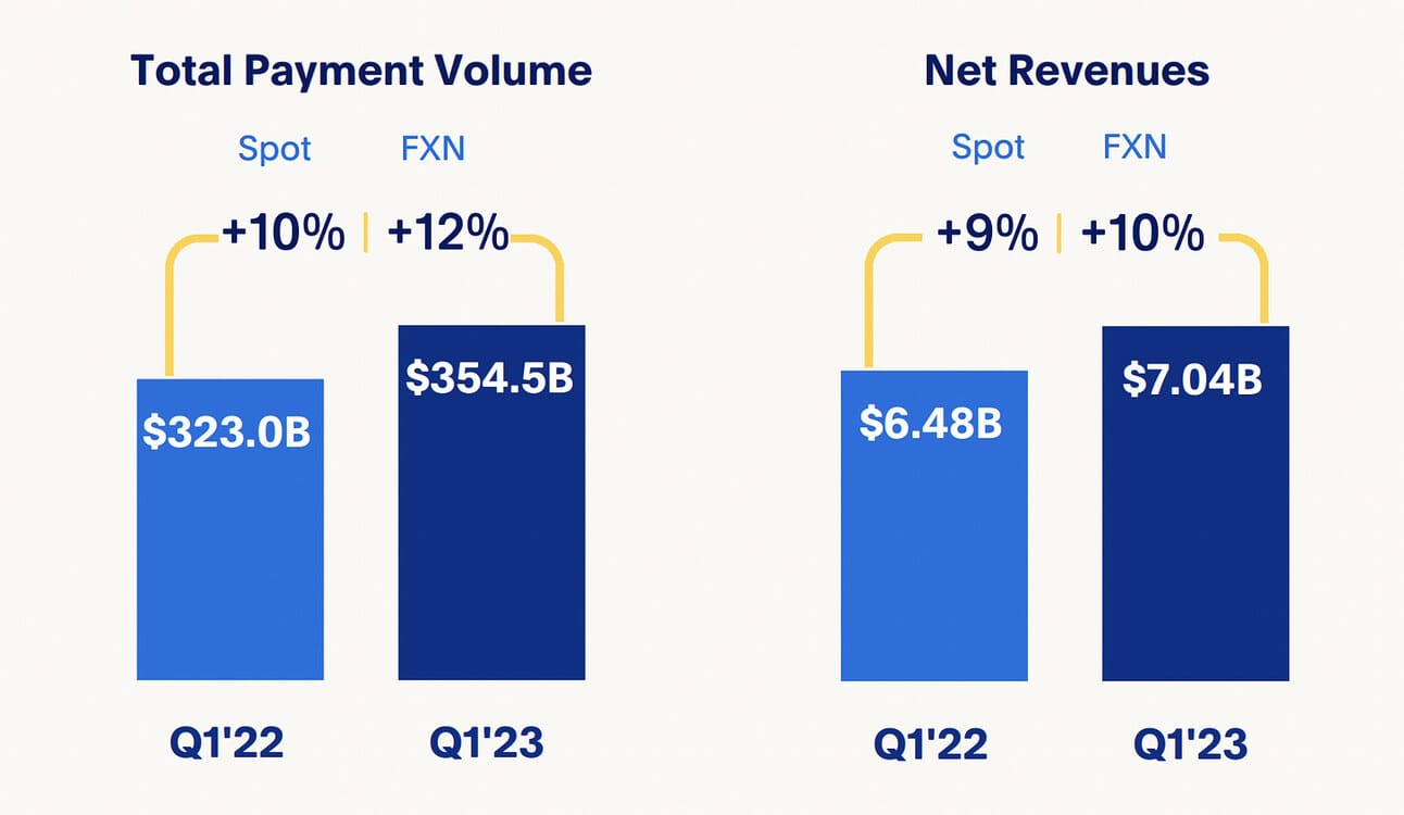 PayPal (NASDAQ: PYPL) reported its first quarter 2023 results yesterday, beating earnings estimates and raising the profit forecast for the year. Nevertheless, the results seem to have disappointed investors, as the stock declined 5.79% in the after-hours trading. Net revenues rose 9% YoY to $7.04 billion, driven by 10% YoY growth in Total Payment Volume. GAAP operating income increased 41% YoY to $1.0 billion, while non-GAAP operating income increased 19% YoY to $1.6B. The company raised full-year 2023 guidance and now expects GAAP EPS to be ~$3.42 per diluted share, a ~64% increase compared to 2022. The company expects non-GAAP EPS to increase ~20% YoY to ~$4.95 per diluted share. PayPal intends to repurchase ~$2 billion of its shares this year.
