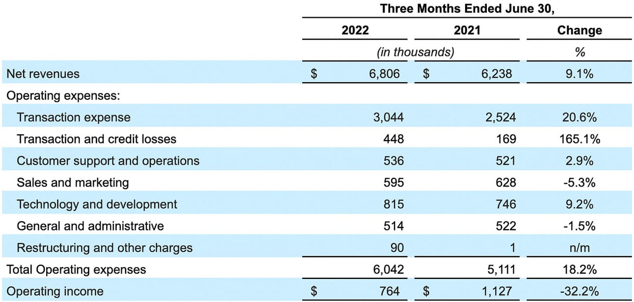 The company reported $6.04 billion in operating expenses, which resulted in an Operating income of $764 million for the quarter (a decline from an Operating income of $1.13 billion in Q2 2021). Total operating expenses increased 18.2% compared to Q2 2021. Transaction expenses and Transaction and credit losses increased 38% YoY and totaled $3.5 billion. Operating expenses excluding transaction-related expenses grew 5.5% YoY and totaled $2.55 billion.
