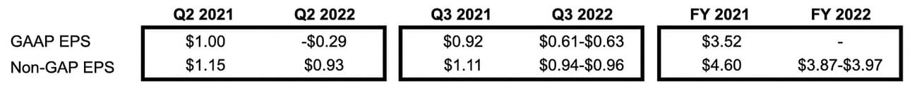 The company’s management guided for a GAAP EPS in the range of ~$0.61-$0.63 and a Non-GAAP EPS of $0.94-$0.96 in Q3 2022, as well as a Non-GAAP EPS of $3.87-$3.97 for the full year 2022. They did not guide for a full-year GAAP EPS.