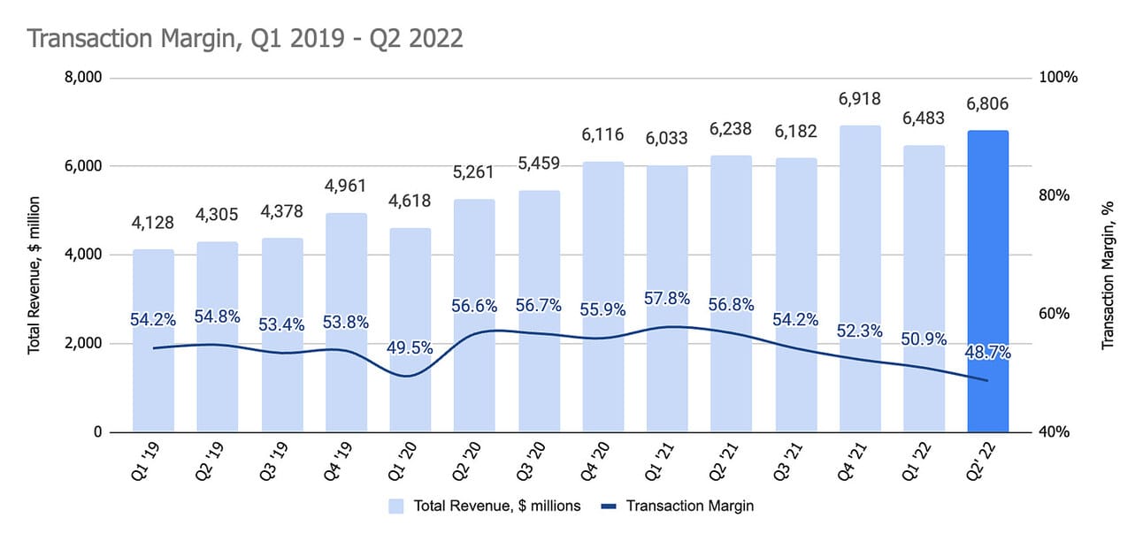 First, I have little doubt that PayPal, given its scale, can find these savings (i.e. renegotiate deals with processors, optimize the organizational structure, etc.). Second, the company’s ability to cut its transaction-related expenses, means that the Transaction margin might stop compressing further. Back of the envelope calculation: 50% of $1.3 billion = $163 million per quarter, or 2.4% margin improvement on the Q2 2022 revenue of $6.8 billion.
