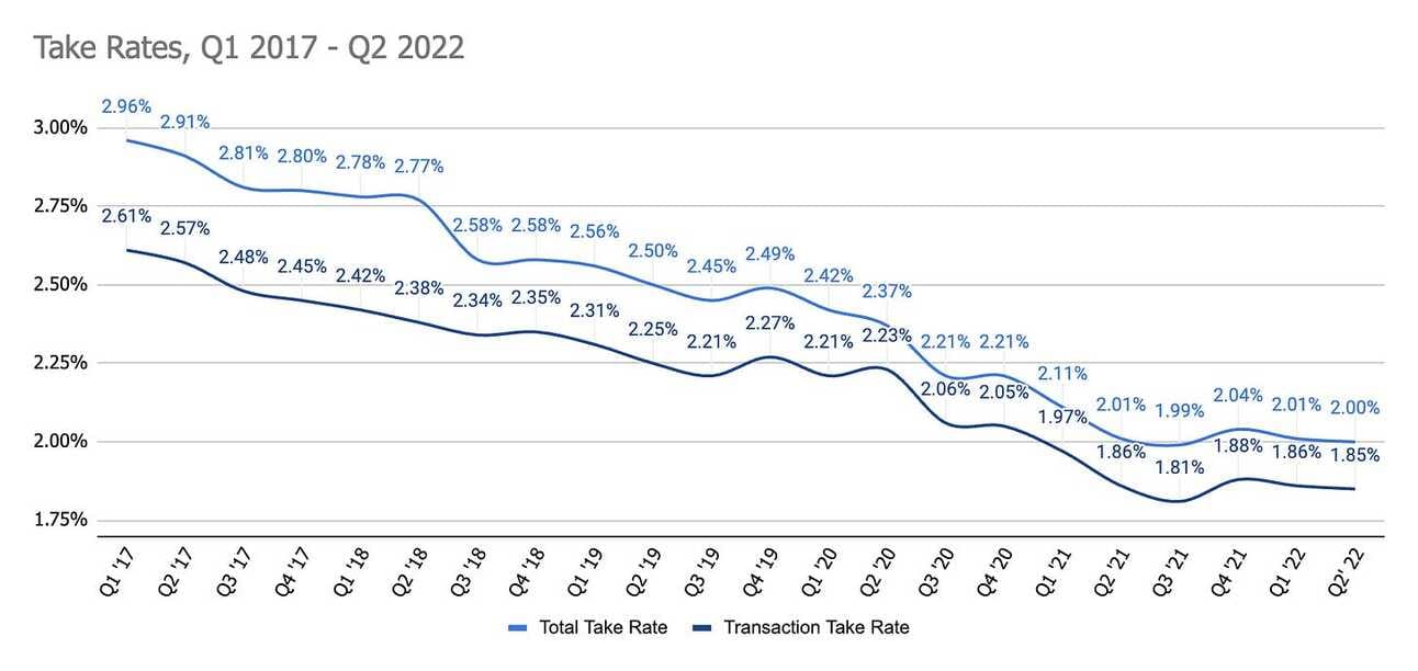 Another positive aspect was that both, the Transaction Take Rate and the Total Take Rate, stopped declining. As you can see from the chart below, the take rates declined sharply during the 2017 - 2020 period, but now seem to remain flat at around 2.00% (Total Take Rate) and 1.85% (Transaction Take Rate).
