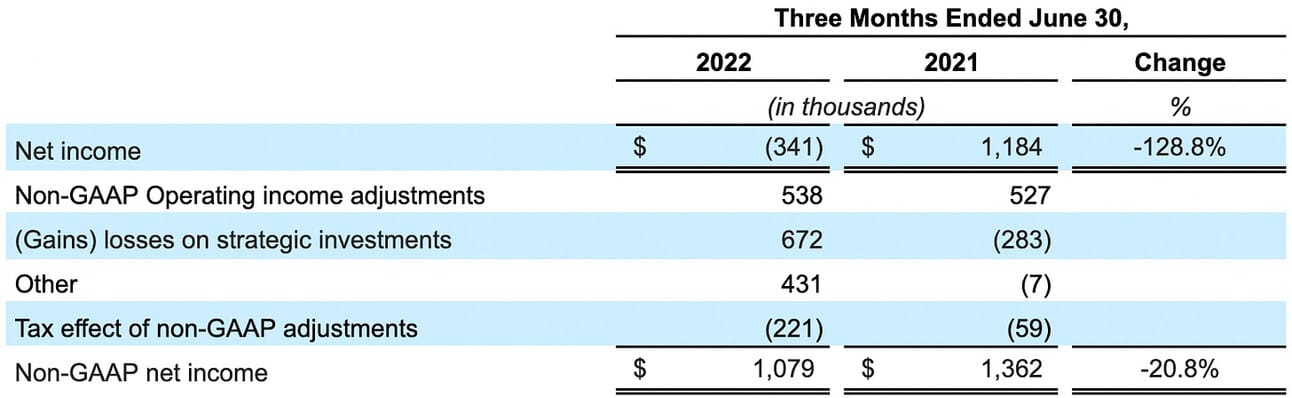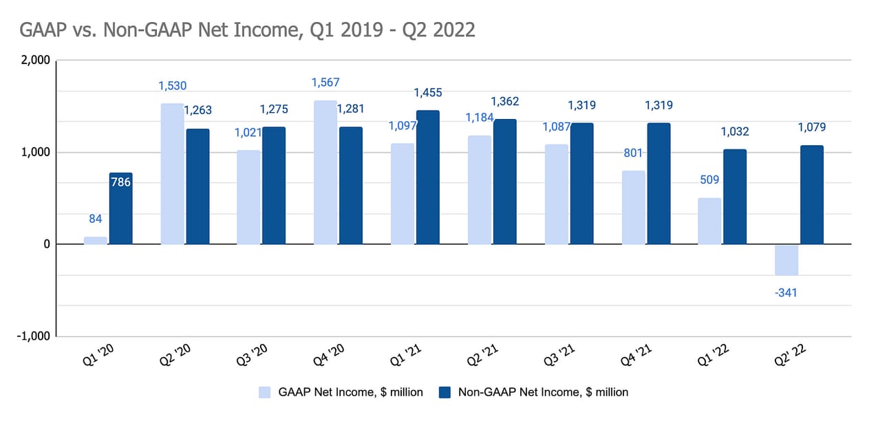 On the adjusted basis, the company reported a Non-GAAP Net Income of $1.1 billion for the quarter (GAAP Net Income adjusted for stock-based compensation, amortization of acquisitions, gains and losses on strategic investments, and one-time expenses), down from $1.4 billion in Q2 2021.