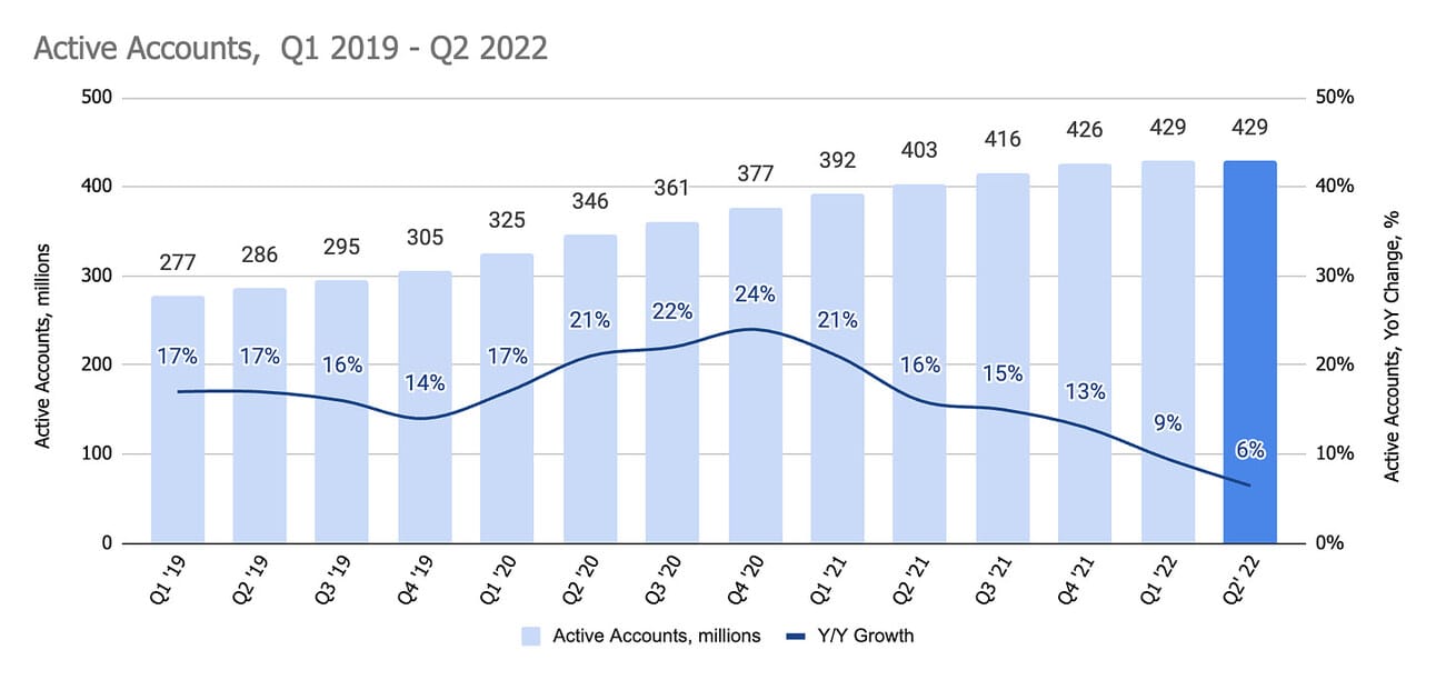 PayPal reported 0.4 million net new active accounts, finishing the quarter with 429 million active accounts, of which 35 million were merchants. This represents a 6.5% increase in active accounts compared to Q2 2021, and the number was pretty much flat compared to the previous quarter. In Q1 2022 PayPal added 2.4 million net new active accounts.
