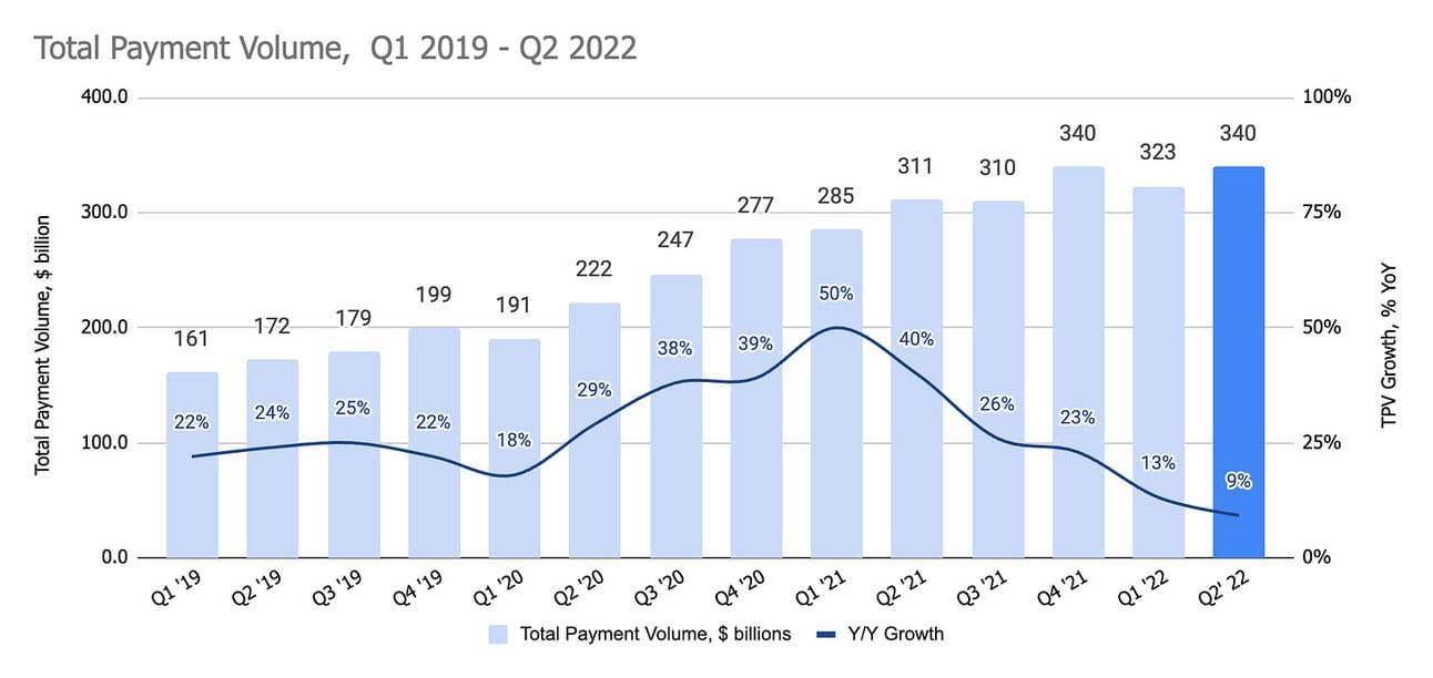PayPal reported $339.8 billion in Total Payment Volume, which represents a 9.3% growth compared to Q2 2021 and a 5.2% growth sequentially (I will use “spot” metrics throughout the text, which is the volume expressed in USD). Excluding eBay, the TPV grew 11% YoY (as I understand there should be no more “excluding eBay” metrics going forward, as eBay volumes in Q3 and Q4 will not be material).