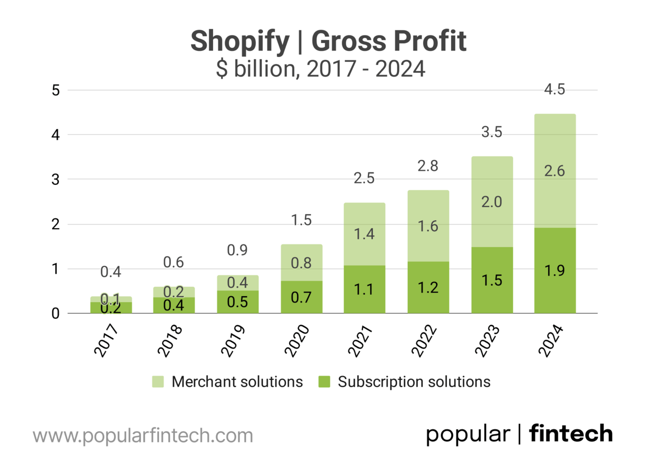 ”Merchant Solutions” also contributed $2.6 billion, or 57% of Shopify’s gross profit (financial services have a lower gross profit margin than subscription services).