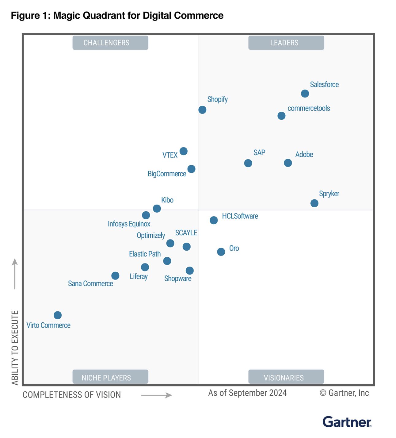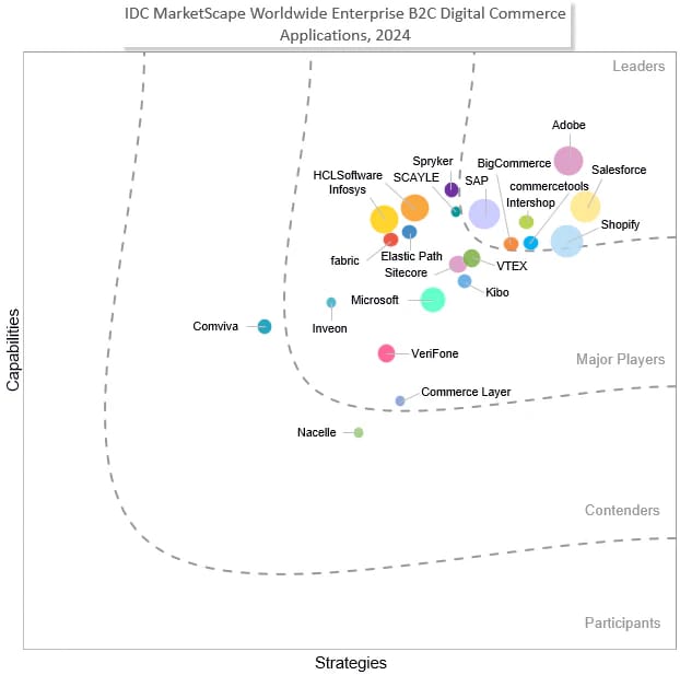 Regardless of which ranking you look at, you'll find Adobe, SAP, and Salesforce, which all entered the commerce platform market through acquisitions. Adobe acquired Magento for $1.7 billion, SAP acquired Hybris for an estimated $1.2–1.5 billion, and Salesforce acquired Demandware for $2.8 billion.