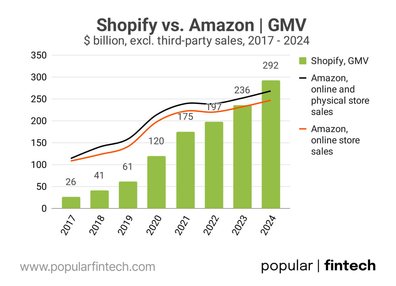 So, who could stop Shopify from continuing to gain market share? I don’t think these would be the incumbents mentioned above (though they will put up a fight). If anyone is capable of disrupting Shopify’s growth, it’s Amazon. In 2024, Shopify’s GMV actually surpassed Amazon's sales in its online and physical stores.