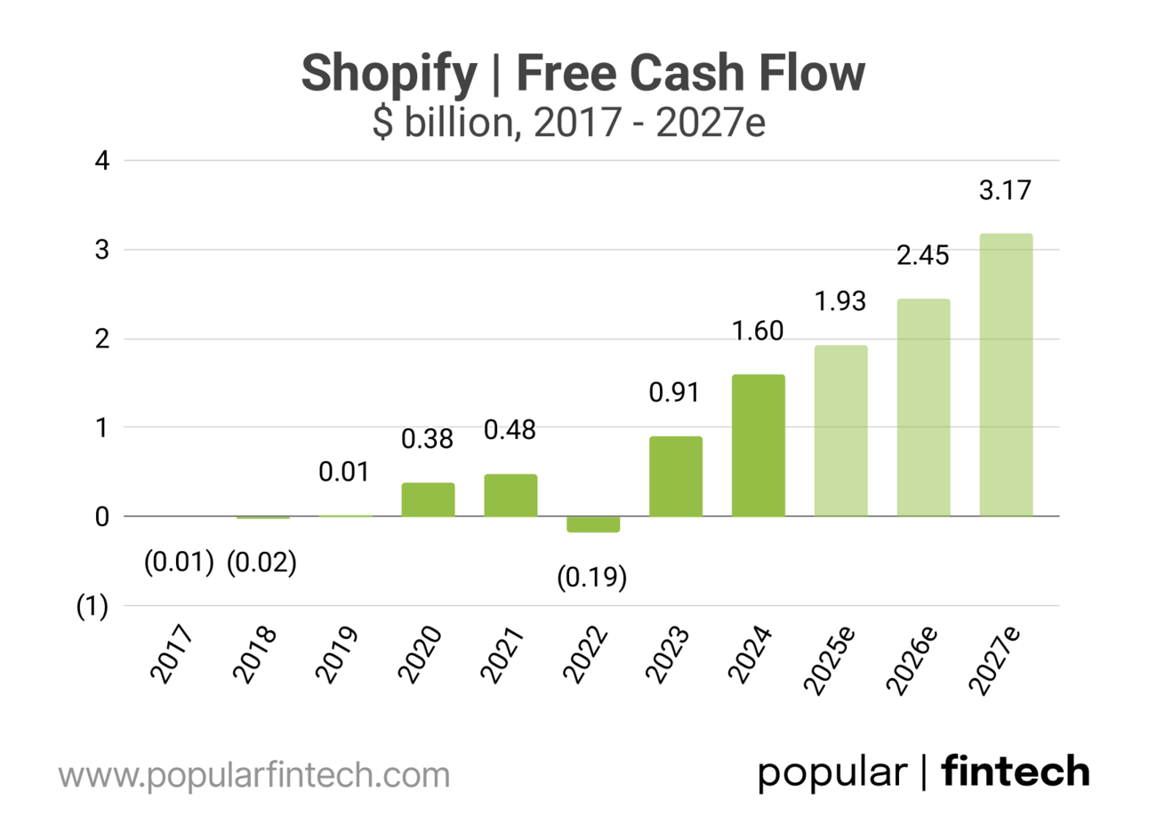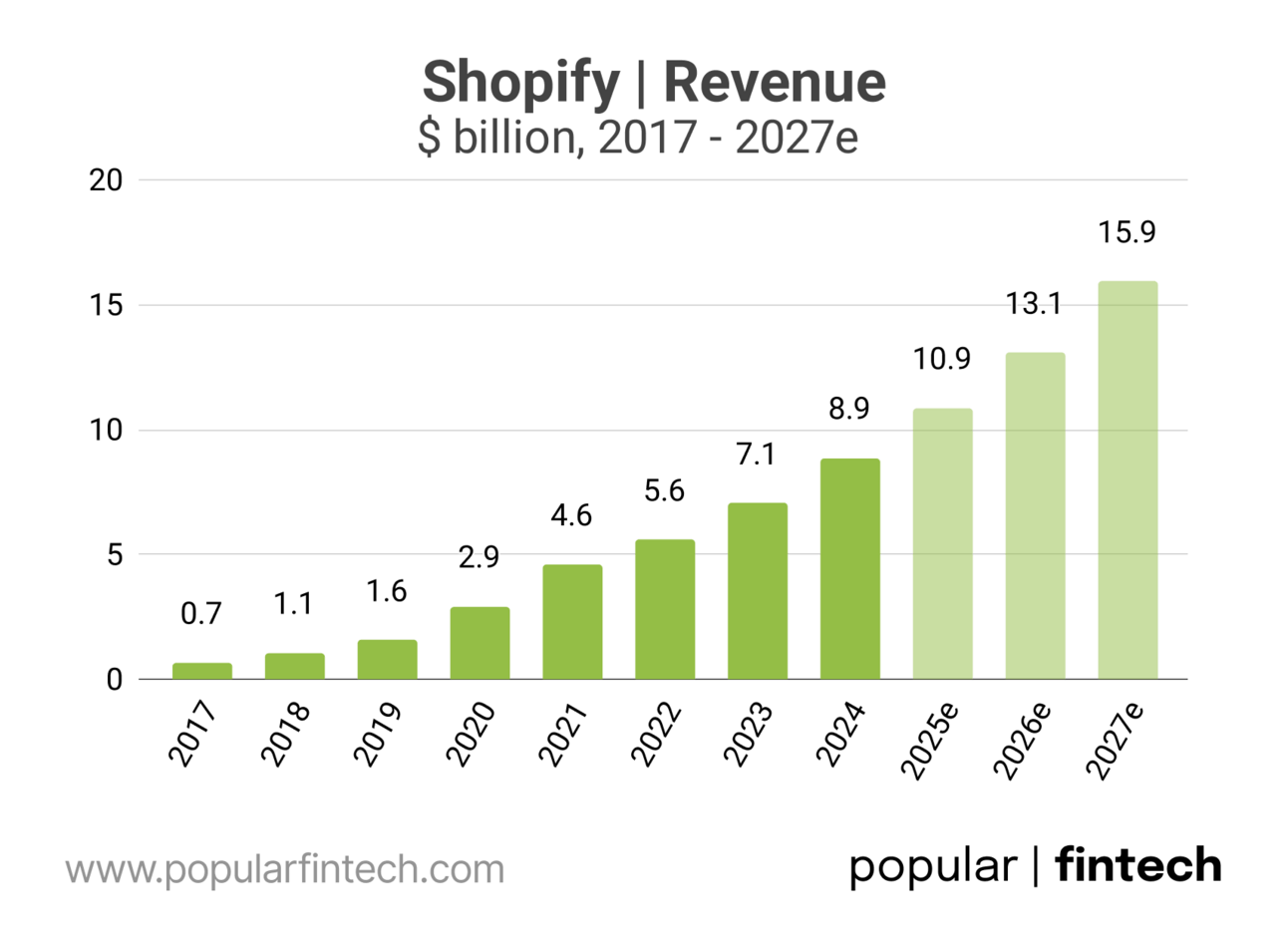 Growth in merchants and GMV has driven revenue expansion, with the company reporting $8.9 billion in revenue in 2024, up 26% from 2023. If analysts’ projections for 2025–2027 materialize, Shopify is on track to achieve a 23x increase in revenue over the decade (2017-2027).
