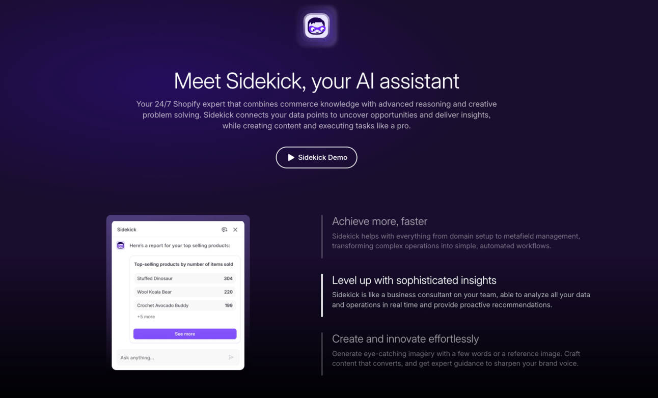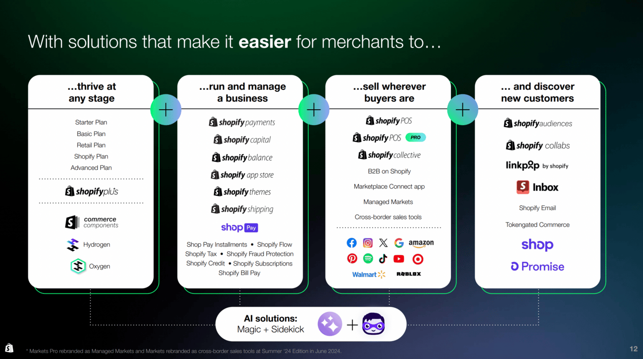 Finally, let’s touch on AI. Shopify offers two AI products to its merchants: Sidekick, an AI assistant that helps merchants run their business by answering questions, offering suggestions, and automating tasks, and Magic, a suite of AI-powered features that help merchants generate product descriptions, emails, and other store content."