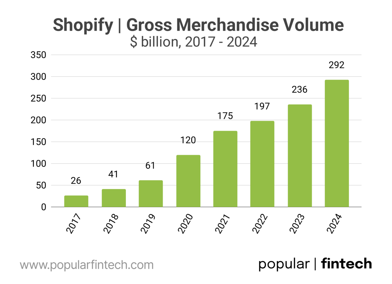 In 2024, Shopify reported $292 billion in GMV (the value of goods and services sold by merchants using the Shopify platform), up 24% from a year ago. GMV grew at a 37% CAGR over the past 5 years, from 2019 to 2024, and a 55% CAGR over the past 10 years, from 2014 to 2024.