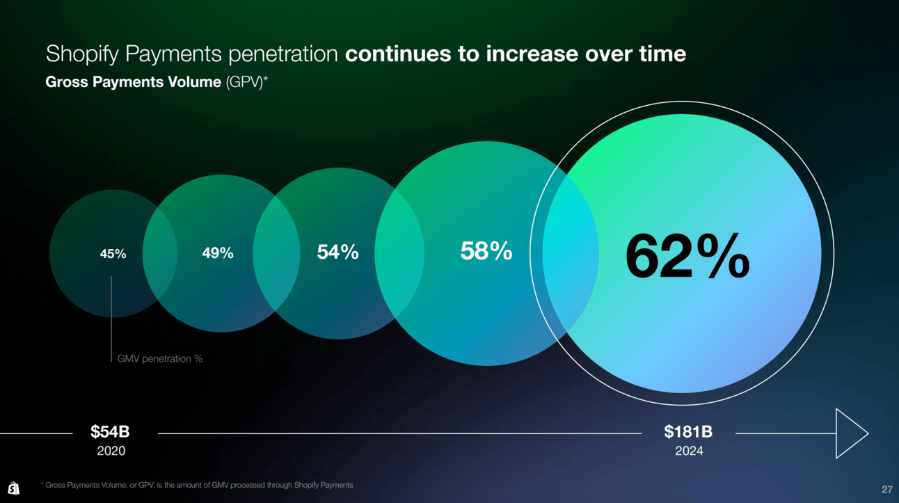 Shopify Payments is the company’s most mature financial services product. Launched in 2013, it processed $181 billion, or 62% of GMV, in 2024. As of Q1 2025, Shopify Payments was available in 39 countries.