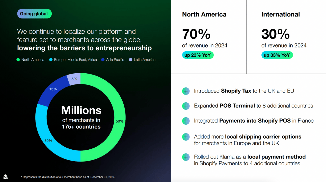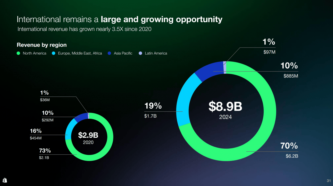 Finally, Shopify continues to expand geographically by winning more international merchants and expanding its product availability. In 2024, North America accounted for 70% of Shopify’s revenue, but international markets are growing at a significantly faster rate.