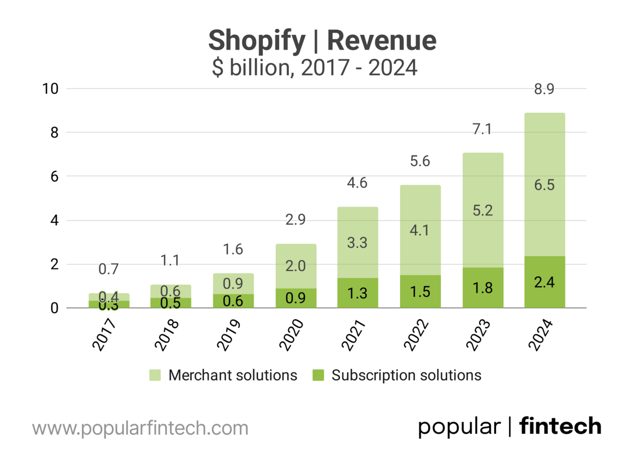 Thus, in 2024, “Merchant Solutions” revenue, which primarily consists of revenue from financial services, contributed $6.5 billion, or 74% of the company’s revenue. The importance of financial services in Shopify’s revenue mix makes me classify Shopify as a Fintech company (which many people still object to).