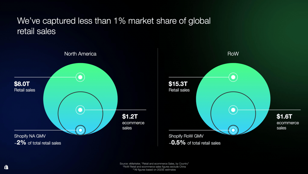 Based on the 2024 revenue of $8.9 billion, Shopify has so far captured slightly over 1% of TAM and 2% of SAM (Serviceable Available Market, or the opportunity within the company’s core geographies).