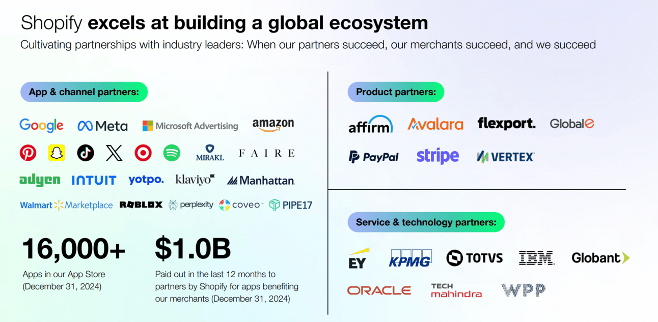 Where Shopify’s scale matters most is in its ability to rapidly ship new features and support a vast ecosystem of app developers. At the end of 2024, the Shopify App Store offered 16,000 apps that extended the platform’s functionality.