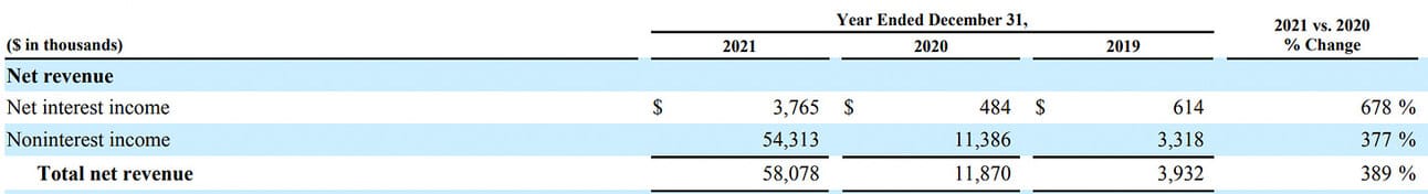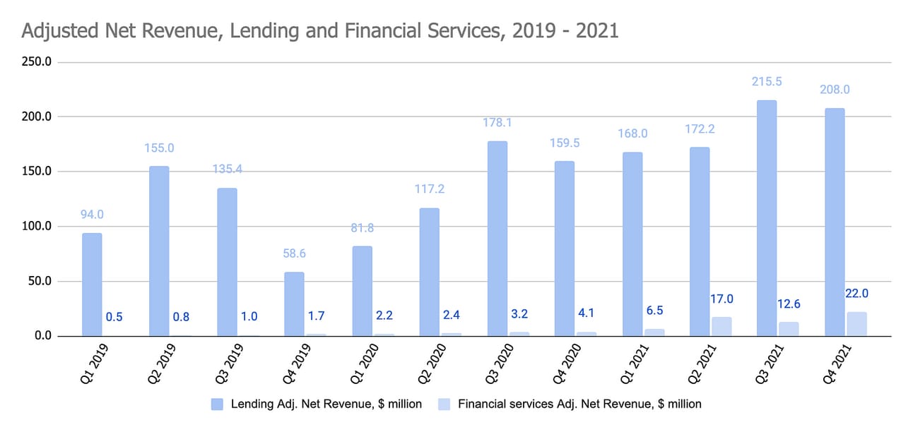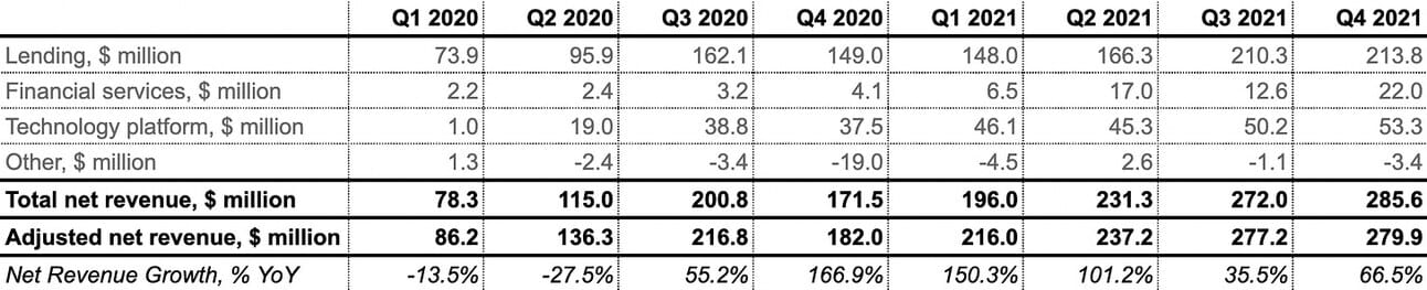 The company uses non-GAAP “Adjusted Net Revenue” in its reporting, adjusting the GAAP net revenue of the Lending segment with fluctuations in the fair market value of the servicing rights and residual rights on securitizations. Thus, on an adjusted basis the company reported $279.9 million in net revenue in Q4 2021 and $1,010.3 million for the full year (representing 54% YoY growth for the quarter and 63% YoY growth for the full year).