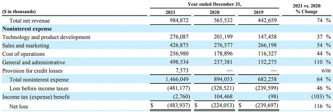 SoFi reported Net loss of $111.0 million in Q4 2021 (an increase from the Net loss of $82.6 million in 2020), and Net loss of $483.9 million for the full year 2021 (an increase from the net loss of $224.1 million in 2020).
