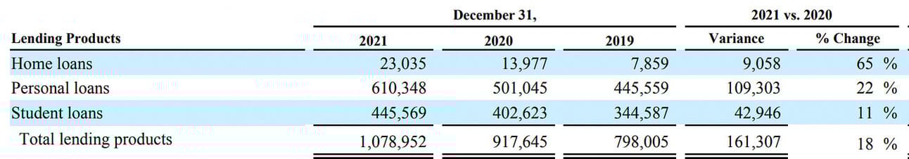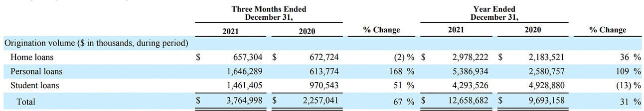 Personal and home loan origination volumes. SoFi has been considerably growing its personal and home loan origination volumes. My understanding from the revenue guidance is that the company is expecting to continue growing these two business in high double-digits.