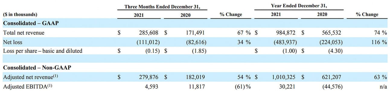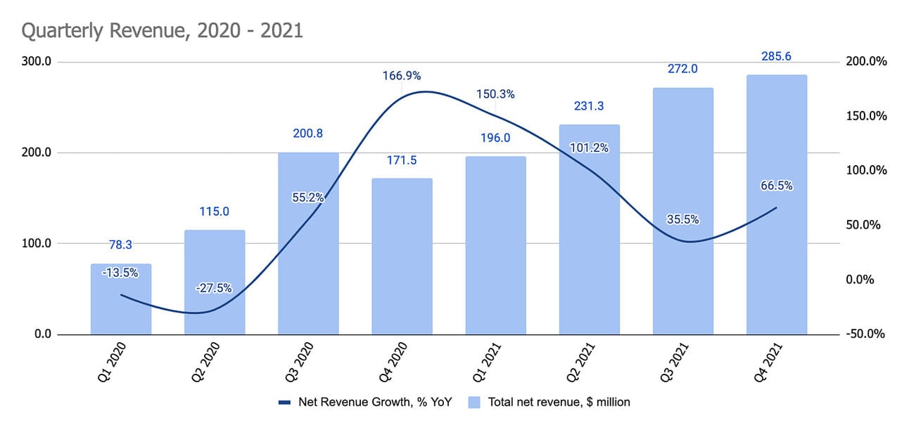 The company reported $285.6 million in net revenue in Q4 2021, and $984.9 million in net revenue for the full year 2021, which represents 66.5% YoY growth for the quarter and 74% for the full year.