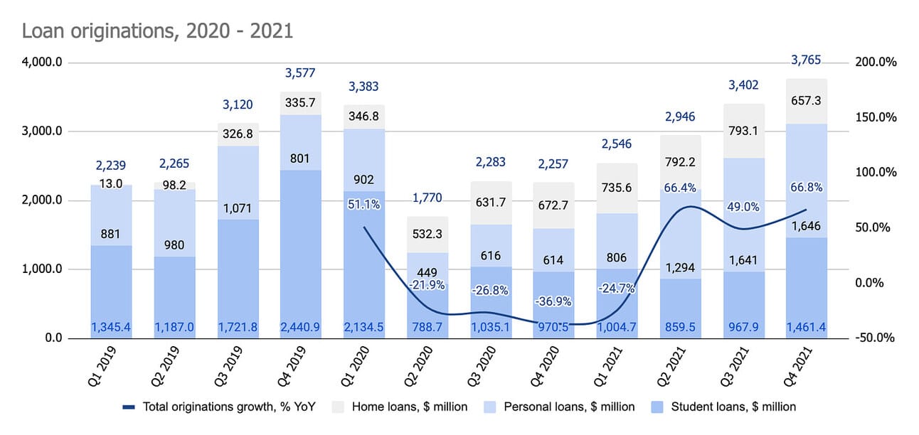 Student loan originations after the end of moratorium. The moratorium clearly hindered student loan refinancing volumes for SoFi in 2020 and 2021 (just getting back to 2019 volumes would mean 50-55% growth in originations). The impact will become noticeable starting from Q2, 2022.