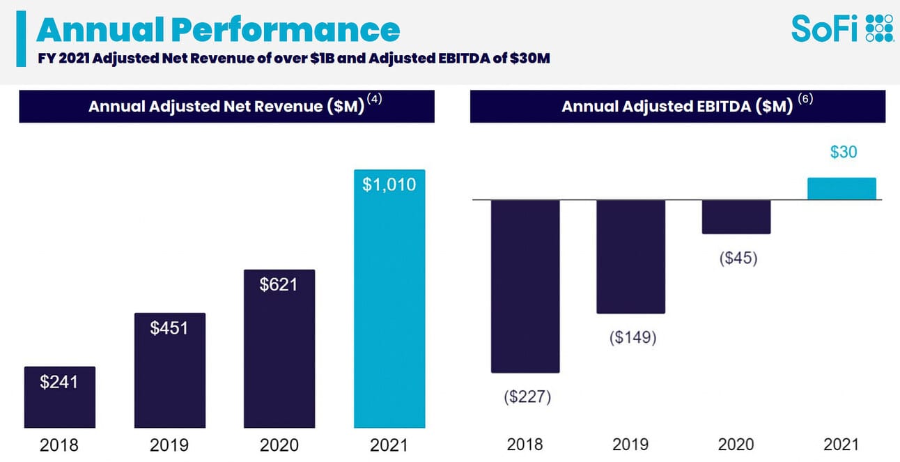 Thus, SoFi reported Adjusted EBITDA of $4.6 million in Q4, 2021 (decrease from $11.8 million in Q4 2020) and $30.2 million for the full year 2021 (an improvement from negative $44.6 million for the full year 2020). Q4, 2021 was the 6th sequential quarter with positive adjusted EBITDA.