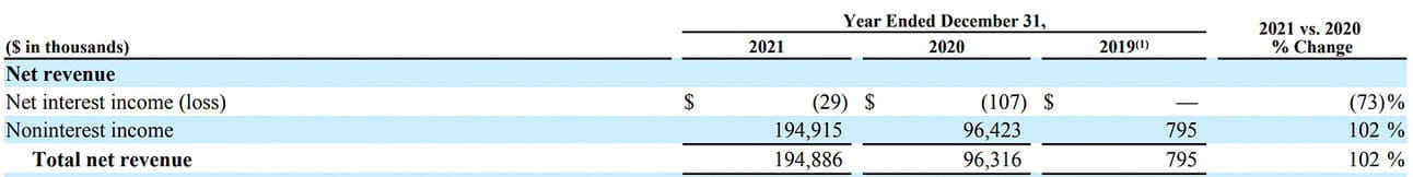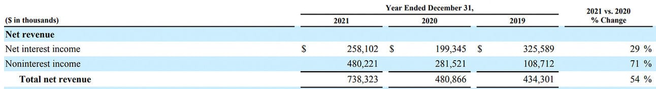 Within their reporting, SoFi splits financial services into two segments, “Lending” and “Financial services”. In total, SoFi generated net revenue of $796.4 million (or 81% of total net revenue) from its financial services in 2021, of which $738.3 million (74% of total net revenue) came from lending (see below),