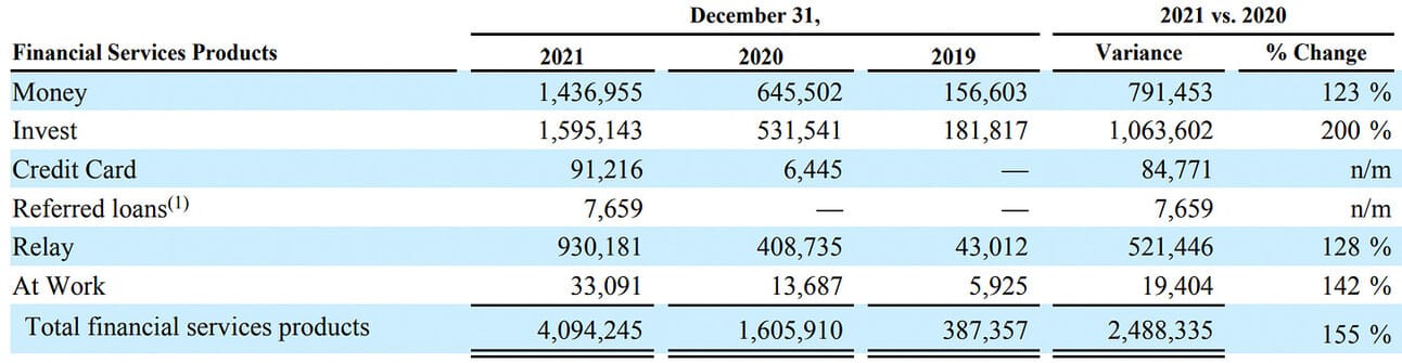 SoFi offers a wide range of financial services (one can call them a “super app”) and boasts 3.46 million customers using their products at the end of 2021. Out of the total customer base, approximately 1.6 million customers use their stock and cryptocurrency trading services (“SoFi Invest”), 1.4 million customers use their cash management account (“SoFi Money”, which will eventually be replaced with “SoFi Checking and Savings”), 1.1 million customers use they lending product (personal loans, student loans, and mortgages), and 0.9 million customers use their account consolidation and budgeting tool (“SoFi Relay”).