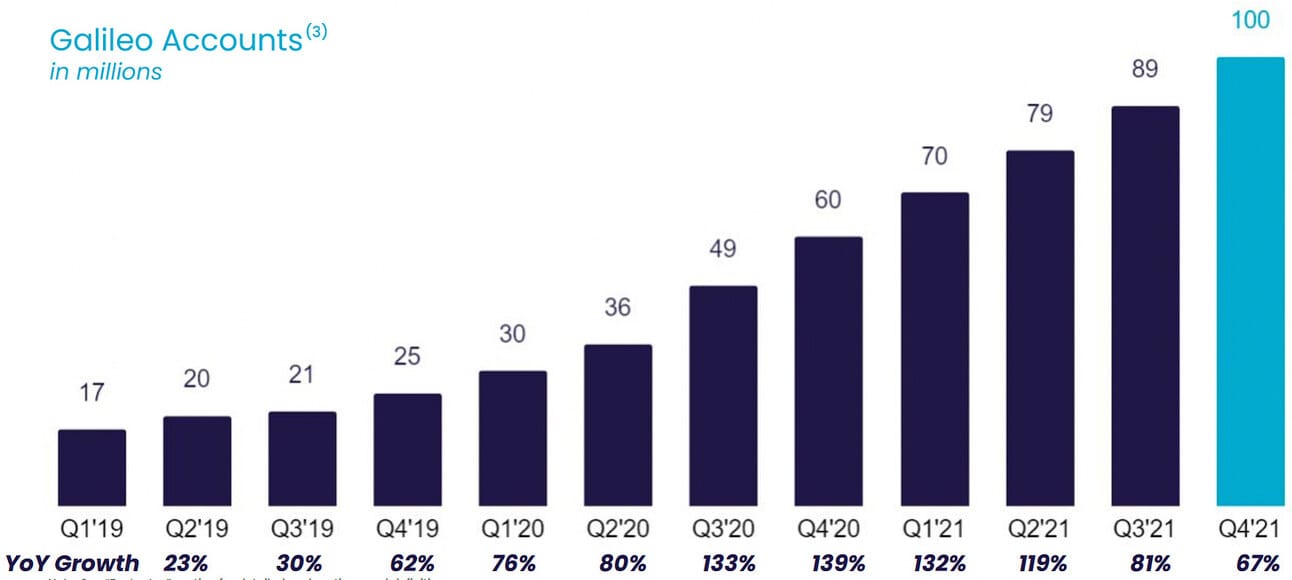 As mentioned above, SoFi gives only the approximate number of clients it has for its Galileo business (100+, of which 44 were added in 2021) and instead reports the number of “Galileo Accounts”, which is the number of their clients' customers (i.e. number of Chime debit cards powered by Galileo). Thus, the company finished the year powering 99.7 million customer accounts, which represents 67% YoY growth (up from 59.7 million accounts at the end of 2020).