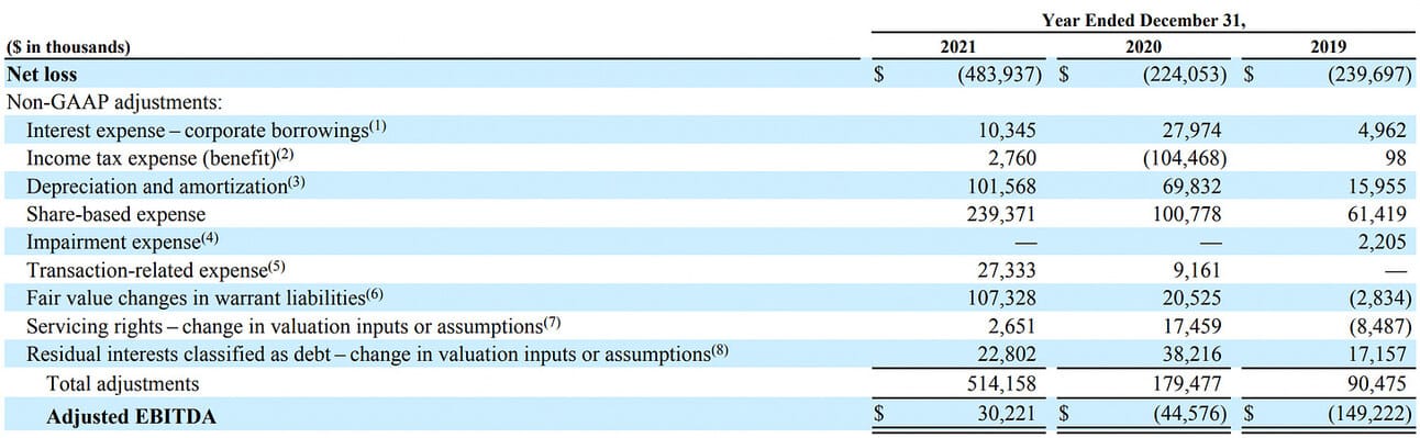 The company reports Adjusted EBITDA as a measure of its profitability. Adjusted EBITDA is calculated through adjustment of Net loss primarily for depreciation and amortization, stock-based compensation, as well as changes in the fair value of warrants, servicing rights and residual interest in securitizations (please see below).