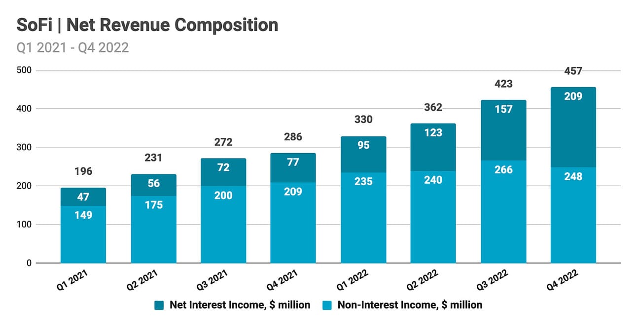 SoFi reported $456.7 million in total net revenue for the quarter, which represents a 59.9% increase compared to Q4 2021, and a 7.7% increase compared to Q3 2022. Net interest income contributed $208.6 million and increased 172.4% compared to Q4 2021, and 32.1% compared to Q3 2022. Non-interest income contributed $248.1 million and increased 18.7% compared to Q4 2021, but declined 6.8% compared to Q3 2022. Net interest income contributed 45.7% of the total net revenue, compared to 26.7% in Q4 2021 and 22.6% in Q4 2020.