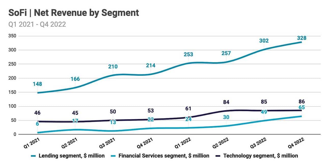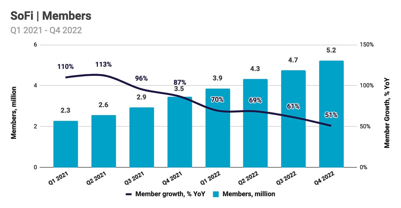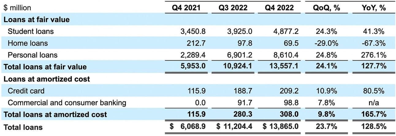 In its consumer segment, SoFi onboarded almost 480,000 new “members” during Q4 2022, reaching a total of 5.2 million. The company’s total customer base increased by 51.0% compared to Q4 2021. The reported number of “products”, which can be used to identify drivers behind member growth, suggests that the growth came from SoFi Relay (+321K products in the quarter), SoFi Money (+193K products), SoFi Invest (+91K products), Lending products, incl. referred loans (+64K products) and SoFi Credit Card (+17K products). One member can use multiple products; thus, the total increase in “products” exceeds the increase in “members”.