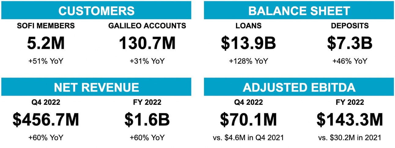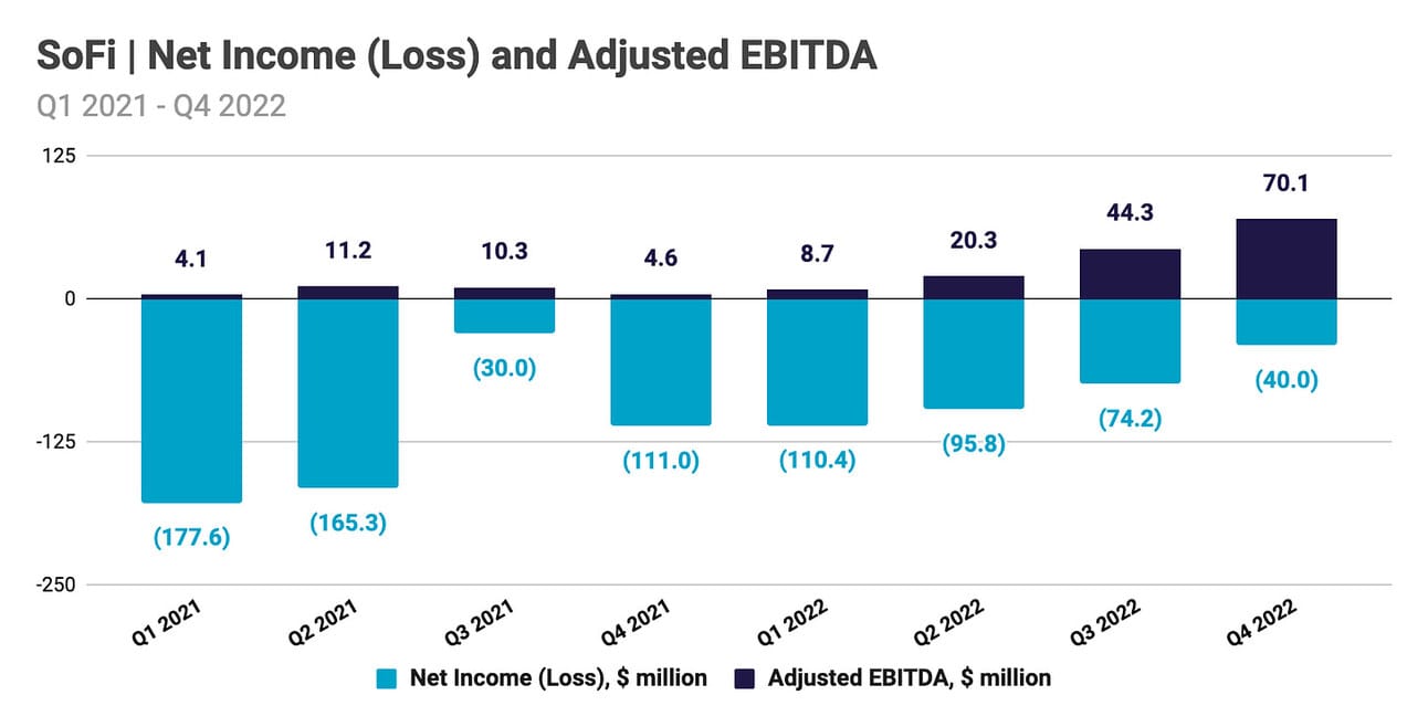 SoFi reported a Net loss of $40.0 million in Q4 2022, compared to a Net loss of $111.0 million in Q4 2021 and $74.2 million in Q3 2022. On an adjusted basis, the company reported an Adjusted EBITDA of $70.1 million, compared to an Adjusted EBITDA of $4.6 million in Q4 2021 and $44.3 million in Q3 2022. The key adjustments in calculating Adjusted EBITDA were share-based compensation, depreciation and amortization (incl. amortization of Galileo and Technisys acquisitions, and SoFi Stadium signage rights), as well as changes in the value of servicing rights.