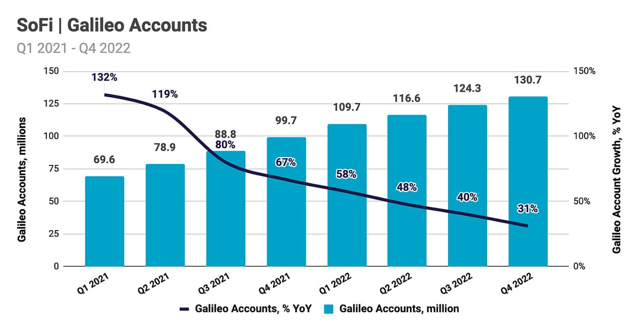 In its technology segment, SoFi added approximately 6.4 million Galileo accounts during the quarter, bringing the total to 130.7 million accounts. This represents a 31.1% increase compared to Q4 2021. Technisys, the core banking solution provider that SoFi acquired in March 2022, does not charge its clients based on the number of serviced accounts (and instead, uses a more “traditional” enterprise pricing model); thus, the company does not report those separately. In Q4 2022, Galileo signed 11 new clients, and Technisys signed 16 new clients. The company also launched “Pay in 4”, the first product “built on the combined Galileo and Technisys platform.”