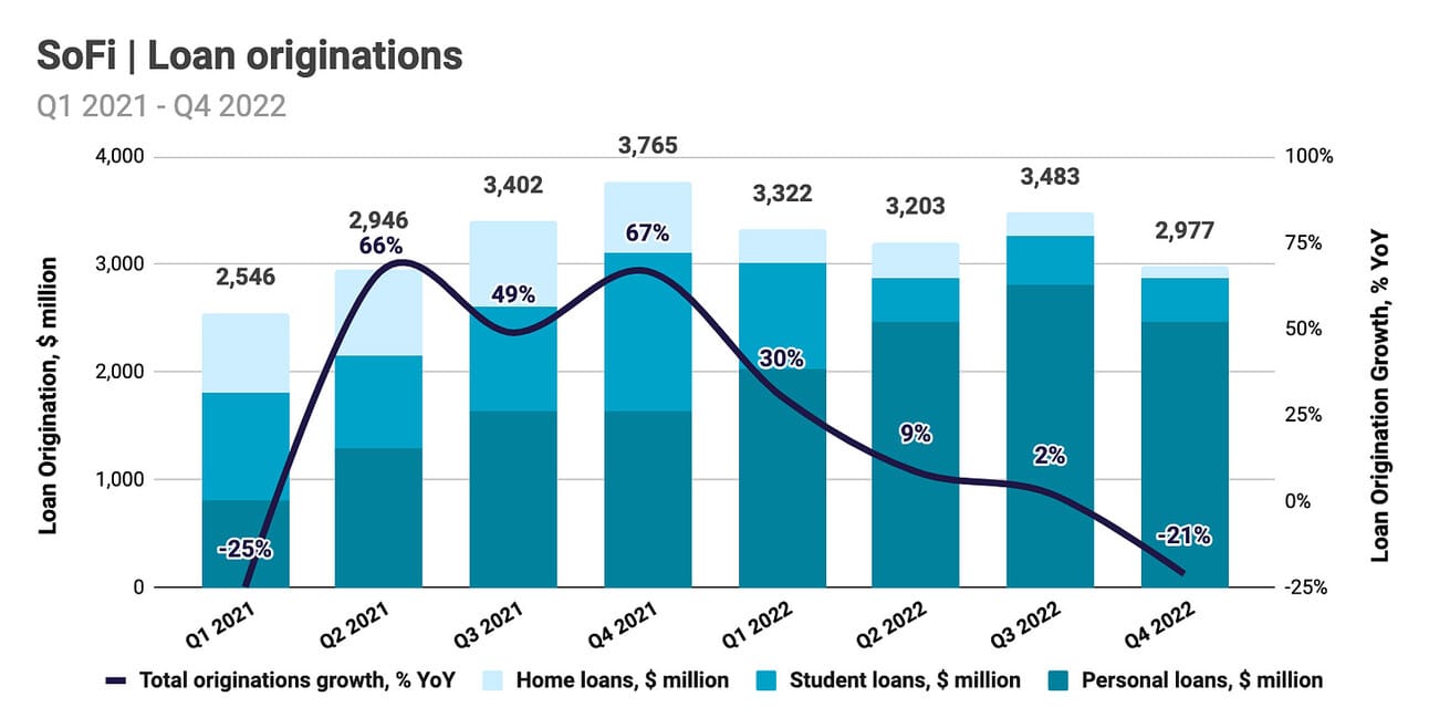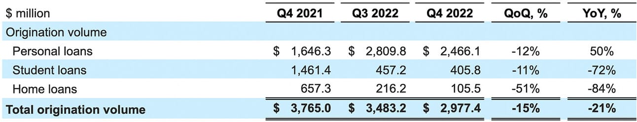 SoFi reported $2.98 billion in loan originations in Q4 2022, which represents a 20.9% decline compared to Q4 2021, and a 14.5% decline compared to Q3 2021. Personal loan originations were $2.47 billion, which represents a 49.8% increase compared to Q4 2021, but a 12.2% decline compared to Q3 2022. Student loan originations declined 72.2% compared to Q4 2021 and 11.2% compared to Q3 2021, while home loans declined 83.9% compared to Q4 2021 and 51.2% compared to Q3 2021. Personal loans represented 82.8% of total originations, compared to 43.7% in Q4 2021, and 27.2% in Q4 2020.