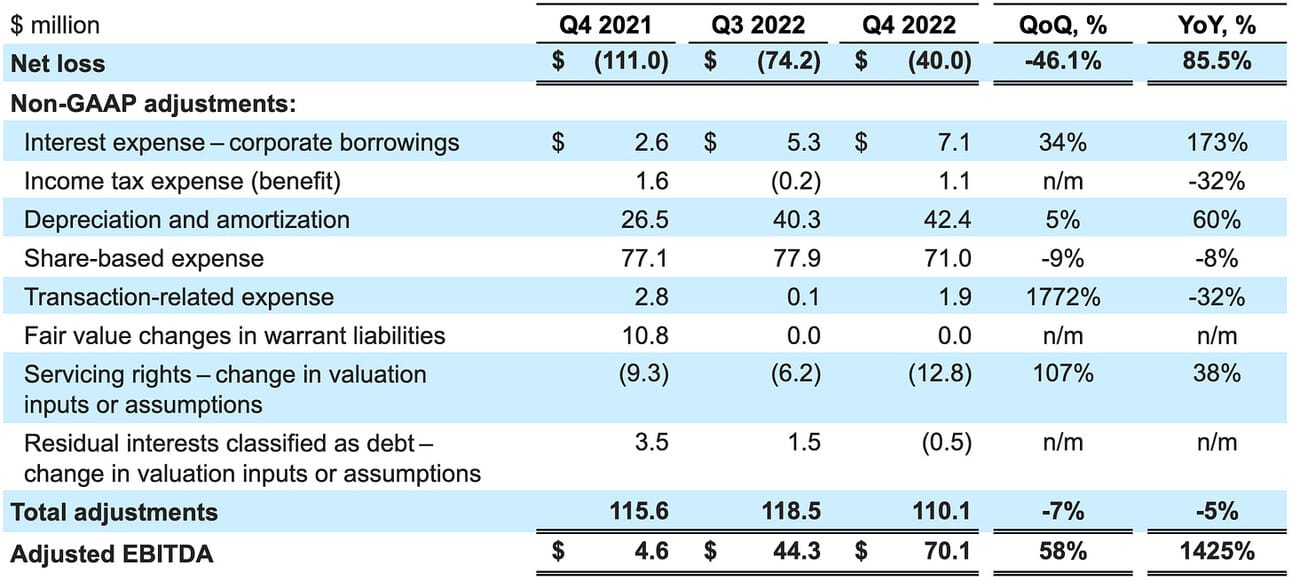The company’s management guided for $430-440 million in Adjusted revenue in Q1 2023, which represents a 34-37% increase compared to Q1 2022, and $1.93 - 2.00 billion in Adjusted revenue for the full year 2023, which represents a 25-30% increase compared to 2022. In order to calculate Adjusted revenue, the company adjusts GAAP net revenue with the changes in the fair value of servicing rights and residual interest in securitizations. In 2022, these adjustments varied from $6.4 to $13.3 million ($8.3 million on average); thus, we can translate the Q1 2023 guidance into (non-adjusted) revenue of approx. $440-450 million.