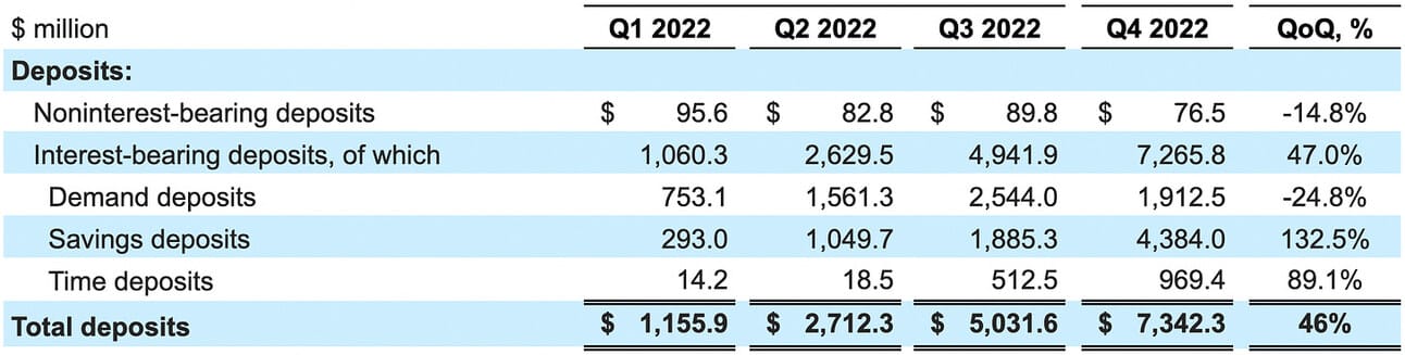 Let’s focus briefly on segments. Income from the Technology segment has been flat throughout 2022 (the increase from Q1 2022 to Q2 2022 was the result of the Technisys acquisition) and given the profile of Galileo and Technisys customers (other Fintech companies), we should not expect rapid (or any?) growth in 2023. The company is pursuing more mature customers, but this change in strategy will take a long time to translate into revenue. Revenue growth in the Financial Services segment is purely the result of internal pricing of deposits (The Lending segment “pays” the Financial Services segment for deposits). Non-interest income from this segment was also almost flat ($20.2 million in Q4 2021 vs. $19.2 million in Q4 2022).