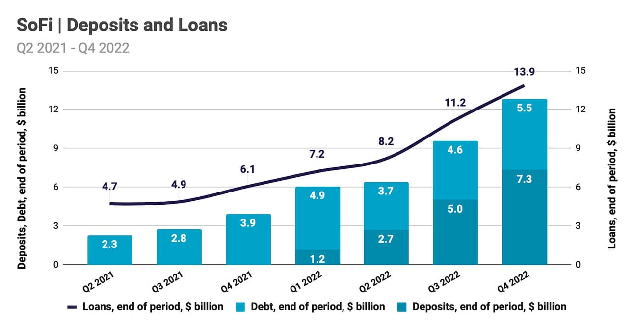 In addition to deposits, SoFi uses other sources of funding to fund loans (such as warehouse funding, which allows the company to accumulate loans before selling them off to investors). Per the earnings call comments, deposits are a cheaper source of capital, and “in Q4 [2022], the difference in our deposit cost of funds and warehouse cost of funds was approximately 190 basis points.” However, as you can see from the chart below, SoFi increased the usage of debt in both Q3 2022 and Q4 2022 (vs. replacing debt with cheaper deposits). The company decided to aggressively scale its loan portfolio, and fuel further growth with interest income.