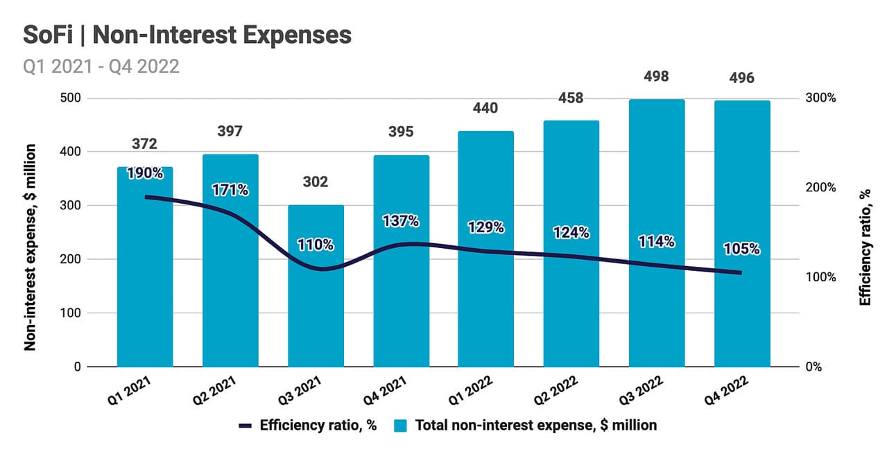 SoFi is still far away from its expected efficiency ratio (non-interest expenses excluding provisions for credit losses divided by net revenue). Thus, the efficiency ratio was 105.3% in Q4 2022, which was an improvement from 136.7% in Q4 2021, but is still considerably higher than the efficiency ratios reported by other banks. Thus, as per FDIC data, the average efficiency ratio for the U.S. banking industry was 57.7% in Q4 2022, and consumer lenders reported an even lower average efficiency ratio of 46.8%. SoFi would need to more than double revenue while keeping the costs fixed to get to the industry average, which is unlikely. Thus, it will take several years for the company to reach its target cost efficiency.