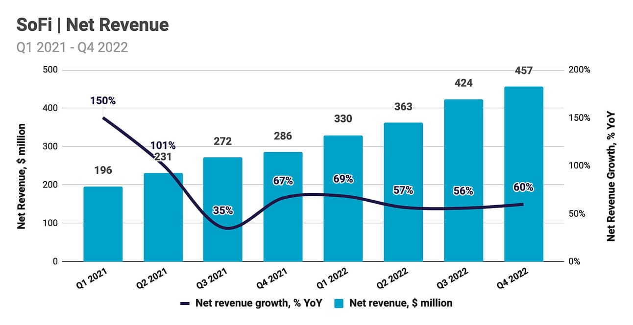 If we use LendingClub and Upstart guidelines as the basis, then it is reasonable to expect SoFi to originate $1.50-1.75 billion in personal loans and $2.00 - 2.25 billion across all loan types (assuming student and home loan originations do not deteriorate further from Q4 2022 levels). The company has accumulated a large enough loan portfolio to meet its Q1 2023 revenue guidance even with these origination volumes. However, a prolonged period of muted loan originations will eventually translate into slower growth in revenue (especially, if the student debt moratorium is extended again beyond June 2023).