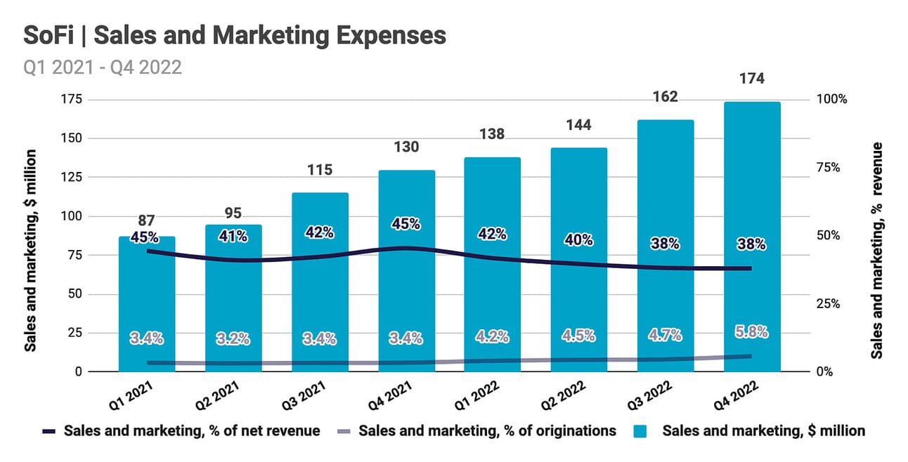 Typically, I would look at the marketing expense divided by the origination volume, in order to understand the marketing efficiency of a consumer lender. However, in addition to marketing its lending products, SoFi spends (or invests) marketing dollars into member and deposit growth, and has two enterprise businesses (Galileo and Technisys) that also require investment. Thus, SoFi spent 38.0% of net revenue on sales and marketing expenses in Q4 2022, compared to 45.4% in Q4 2021. However, in the longer term, I would still expect sales and marketing expenses to represent less than 3% of the company’s originations (compared to 5.8% in Q4 2022).