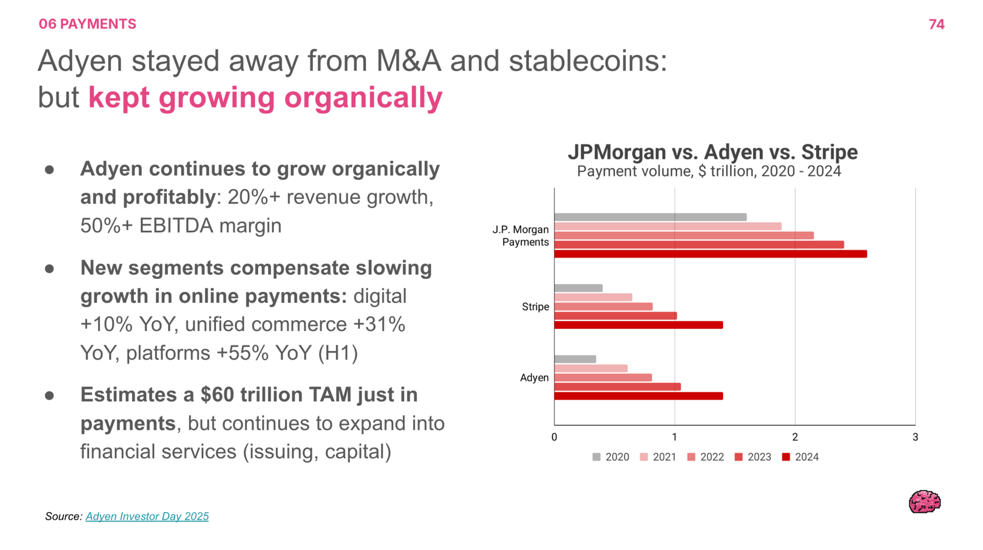 The pace of innovation is accelerating, and scale is no longer a moat if you can’t innovate as fast as your smaller competitors. Those smaller competitors will grow up faster than you expect. Just look at Stripe and Adyen.
