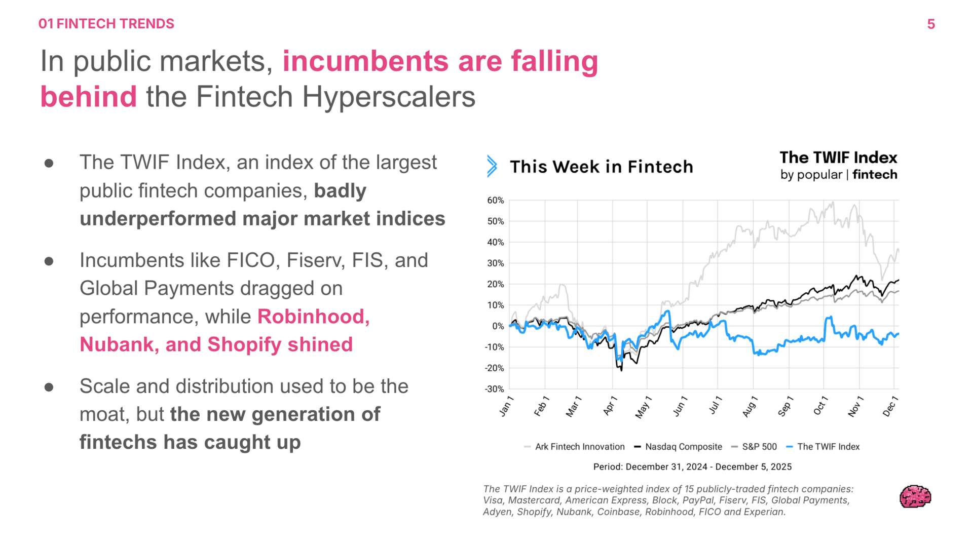 2025 was a difficult year for public Fintech companies. The TWIF Index badly underperformed the S&P 500 and Nasdaq. Incumbents like FICO, Fiserv, FIS, and Global Payments struggled, and pulled the index down with them.