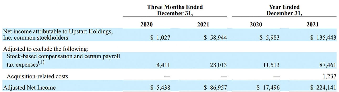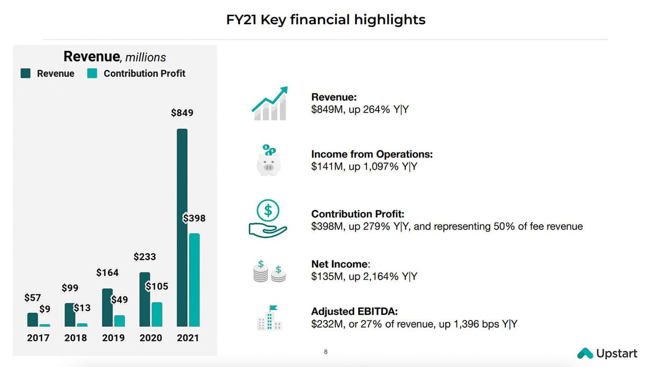 Upstart reported Net Income (GAAP) of $58.9 million for Q4 2021 ($0.61 per share) and $135.4 million for the full year 2021 ($1.43 per share), which represents 5,639% YoY growth for the quarter, and 2,164% growth for the full year.