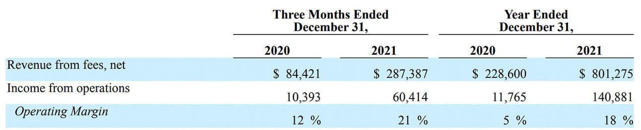 Operating Margin, in turn, is calculated as Income from Operations (Total revenue less Expenses) divided by the Revenue from fees, and indicates % of the revenue that is left after deducting all expenses (including marketing, operations, development, administrative, etc).