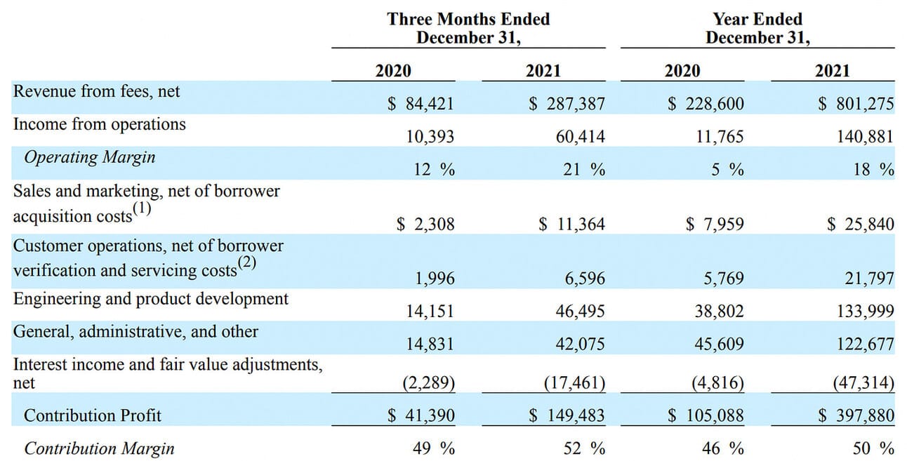 The company did not provide Net Income guidance for the full year 2022, but the guidance on Adjusted EBITDA margin suggests moderate growth in Adjusted EBITDA and thus, Net Income. At the same time, they guided for 45% Contribution Margin, which is similar to 2021. My guess would be that they plan to invest heavily in engineering and product development to develop new products (such as small-dollar, SME loans and mortgages).
