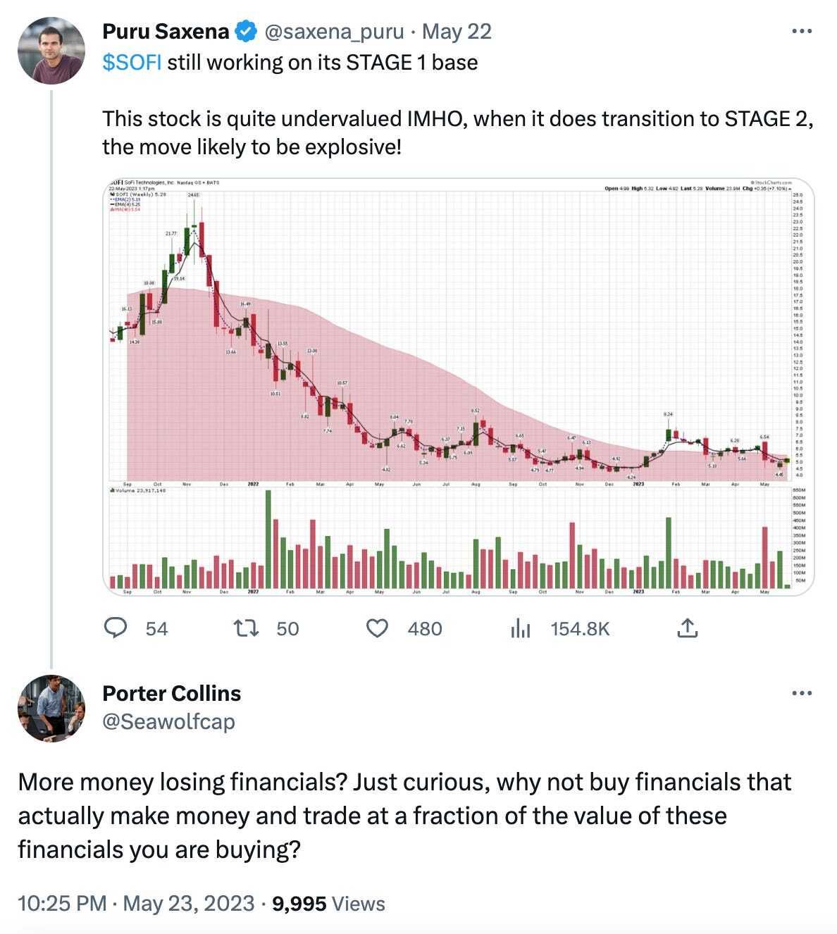 Sharing a tweet instead of a chart today. Porter Collins, an investor, whom you might have seen in “The Big Short” movie, wrote a tweet that stuck in my head. “More money losing financials? Just curious, why not buy financials that actually make money…” commented Collins about SoFi (NASDAQ: SOFI). He’s kind of right….🙊