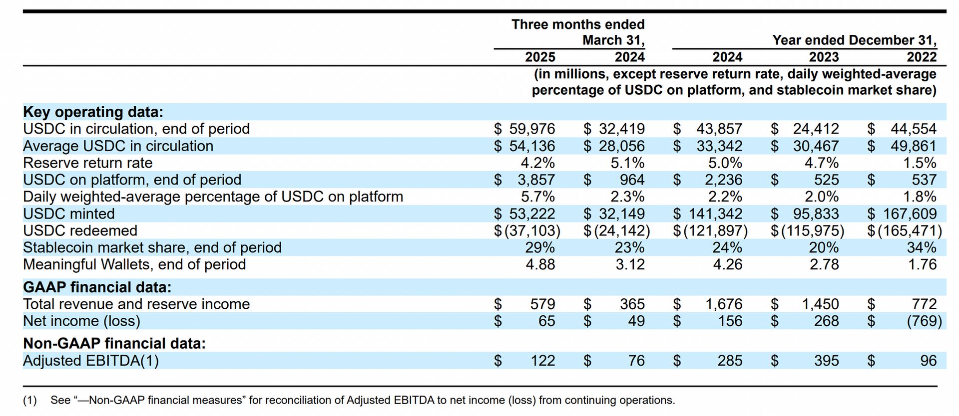 In 2024, Circle reported $156 million in net income and $285 million in adjusted EBITDA, down from $268 million and $395 million, respectively, in 2023. The decline was primarily driven by higher distribution costs following the renegotiation of terms with Coinbase (more on that below).