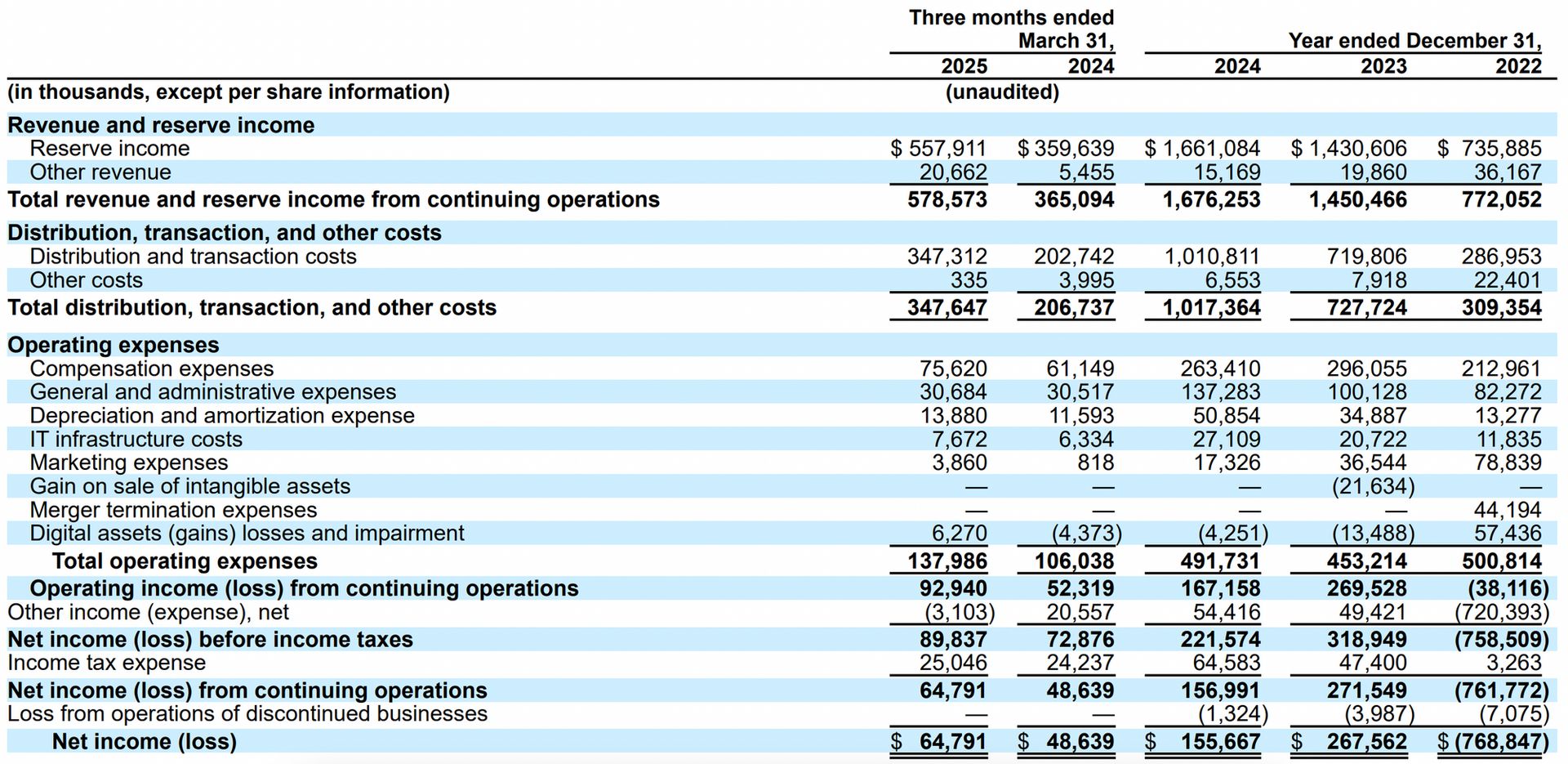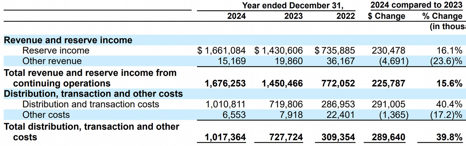 "For the years ended December 31, 2024, 2023, and 2022, we incurred $907.9 million, $691.3 million, and $248.1 million, respectively, of distribution costs in connection with our agreements with Coinbase."